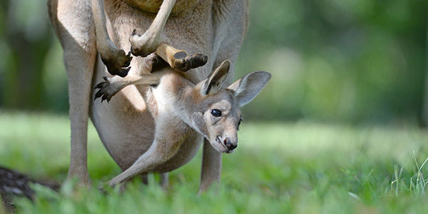 With males standing up to 1.8 metres (6 feet) tall, red kangaroos are the largest of all macropod species! They can be easily distinguished from other species by their red and orange colouration, black and white patches on their cheeks and white tail tip. They often have a white stripe that extends from the corner of the mouth to the ear. Females are typically greyish-blue in colour and stand to be a little smaller than their male counterparts.