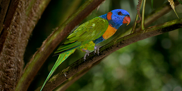 Red-collared lorikeets are found throughout woodlands, swamps and suburban areas of northern Australia. They are distinguished from their relative, the rainbow lorikeet, by the distinct reddish-orange collar around their neck.