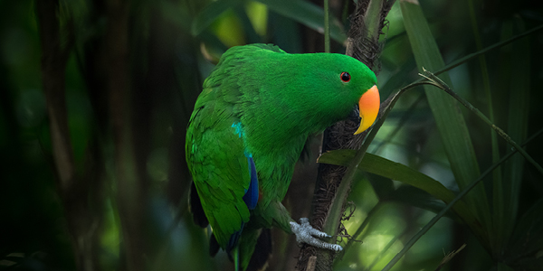 The eclectus parrot is found throughout the rainforests of eastern parts of far north Queensland, the Solomon Islands, Papua New Guinea and Moluccas. They are a sexually dimorphic species, meaning males and females look different! Males are a vibrant, emerald green with red and blue underwings and an orange beak. The females are bright red with dark purple under their wings and a black beak.