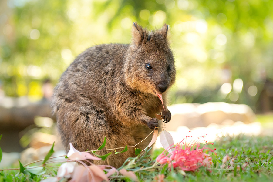 These curious and friendly animals can climb heights of up to two metres to snack on native blossoms and leaves. Quokkas have the ability to survive extended periods without food and water by tapping into the fat reserves in their tail.