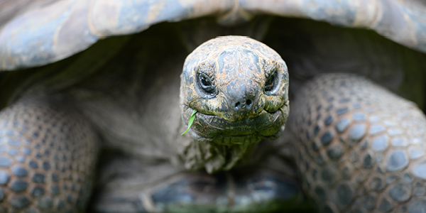 Aldabra tortoises are native to the islands of the Aldabra Atoll and Seychelles, off the east coast of Africa. These reptiles are one of the largest tortoise species in the world. Crikey! Adults in this species stand at over 1 metre (3.2 feet) and weigh in at a whopping 300 kilograms (660 pounds). These slow-moving tortoises carry their homes on their back, it acts as their refuge from any would-be predators! When under threat the tortoise will tuck its long neck and head inside its shell, folding their muscular-scaled legs in front of them, denying any uninvited animal access into their personal space. However, some visitors, such as small birds and lizards, are welcomed under their shell and into their skin folds. These small animals play an important role in removing any insects and parasites from their tough, leathery skin!