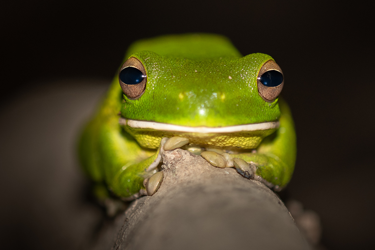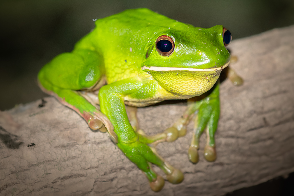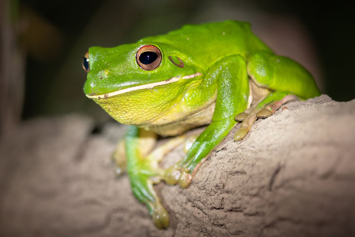 You can generally find these beautiful amphibians in the coastal areas of northern Queensland and Papua New Guinea. They are bright green on top, with an off-white belly and a distinctive white stripe along their lower lip. If you manage to spot one, keep an eye out for a pinkish colour on their legs. This is a sign that it’s mating season for the frogs and you’ve found yourself a male!