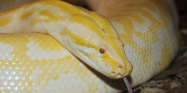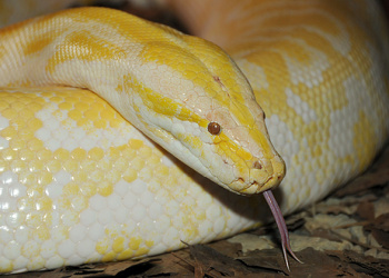 Hi there! My name is Alimah, the Burmese python. I’m not your average python because I am albino. My scales are white and yellow and absolutely stunning!